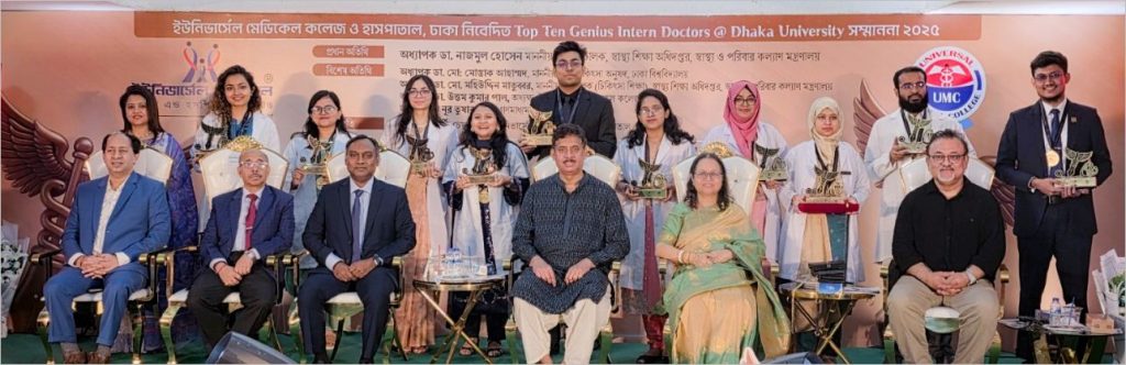 চলতিবছর ঢাকা বিশ্ববিদ্যালয়ের অধীনে অনুষ্ঠিত এমবিবিএস ফাইনাল প্রফেশনাল পরীক্ষা–মে ২০২৫ এ সর্বোচ্চ ফলাফল অর্জনকারী দশজন মেধাবী নবীন চিকিৎসককে স্বীকৃতি জানাতে দেশে প্রথমবারের মতো “Top Ten Genius Intern Doctors @ Dhaka University সম্মাননা ২০২৫” আয়োজন করেছে রাজধানীরইউনিভার্সেল মেডিকেল কলেজ হাসপাতাল।